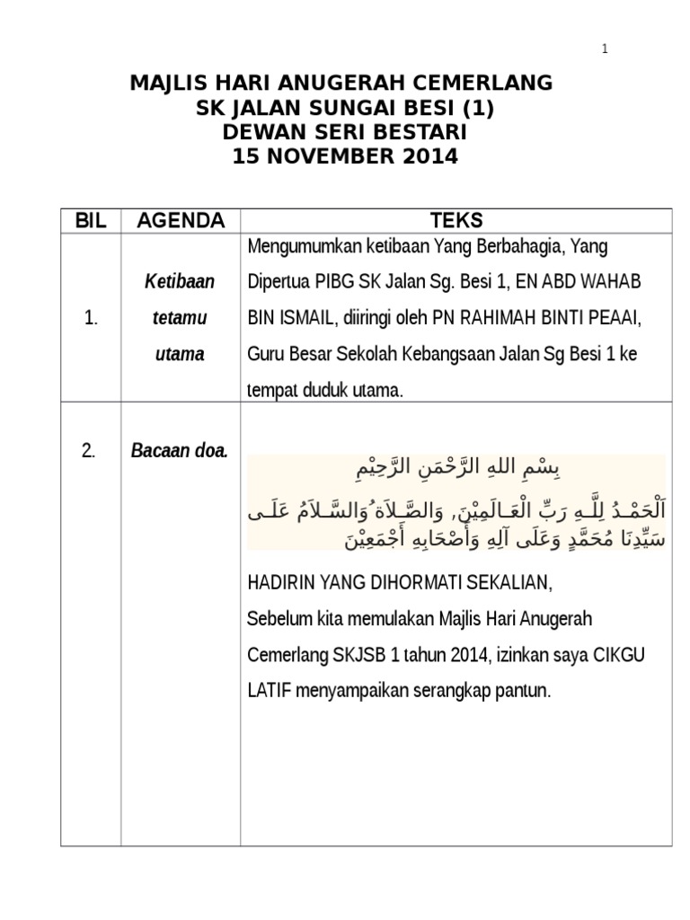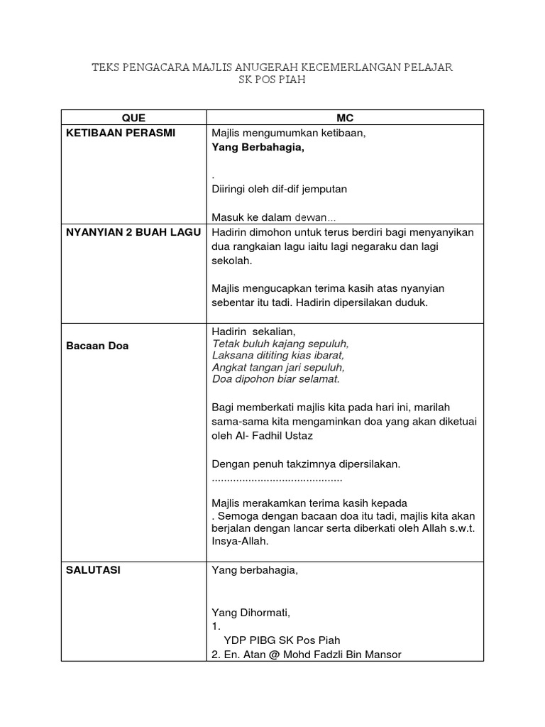 Teks Pengacara Majlis Anugerah Kecemerlangan Pelajar from reader015.staticloud.net Mengumumkan ketibaan yang diraikan en. Pihak sekolah berbesar hati menyampaikan cenderamata tanda kenangan kepada yang berbahagia encik jumat bin jaafar. Selamat datang ke, majlis, hari anugerah cemerlang, sk taman molek. Terima kasih diucapkan kepada semua yang telah memberikan kerjasama. Masuk ke perkarangan majlis, para hadirin diminta untuk berdiri. Majlis persaraan pegawai pendidikan merupakan sebahagian tatacara operasi piawai atau s.o.p. Apabila diumumkan ketibaan para tetamu jemputan. Teks pengacara majlis perpisahan en.